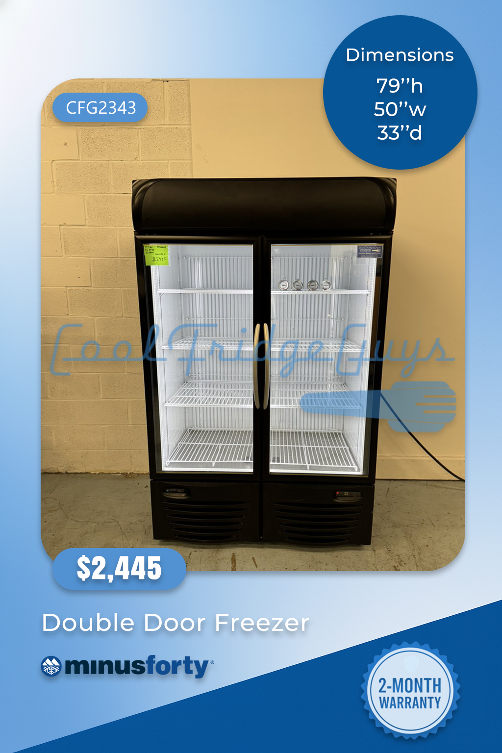 The Minus Forty Model 44 UDGFX1 Double Glass Door Freezer is a commercial-grade freezer engineered for high-visibility frozen product display and consistent performance in demanding retail environments. With a full-height 79-inch design and a wide 50-inch footprint, this unit offers excellent merchandising capacity while maintaining efficient temperature control.